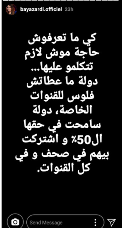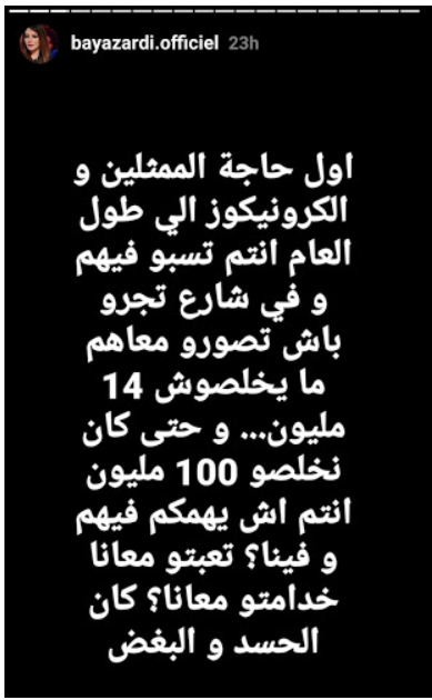 هاجمت الاعلامية في قناة الحوار التونسي بية الزردي فئة من ابناء وطنها معتبرة اياهم منفصمي الشخصية ومرضى حسب قولها وانتقدت الزردي تصرفات الشعب التونسي وانسياقها وراء الاخبار دون تدقيق وشتمه لامثالها ثم ملاحقتهم في الاماكن العامة لالتقاط الصور.