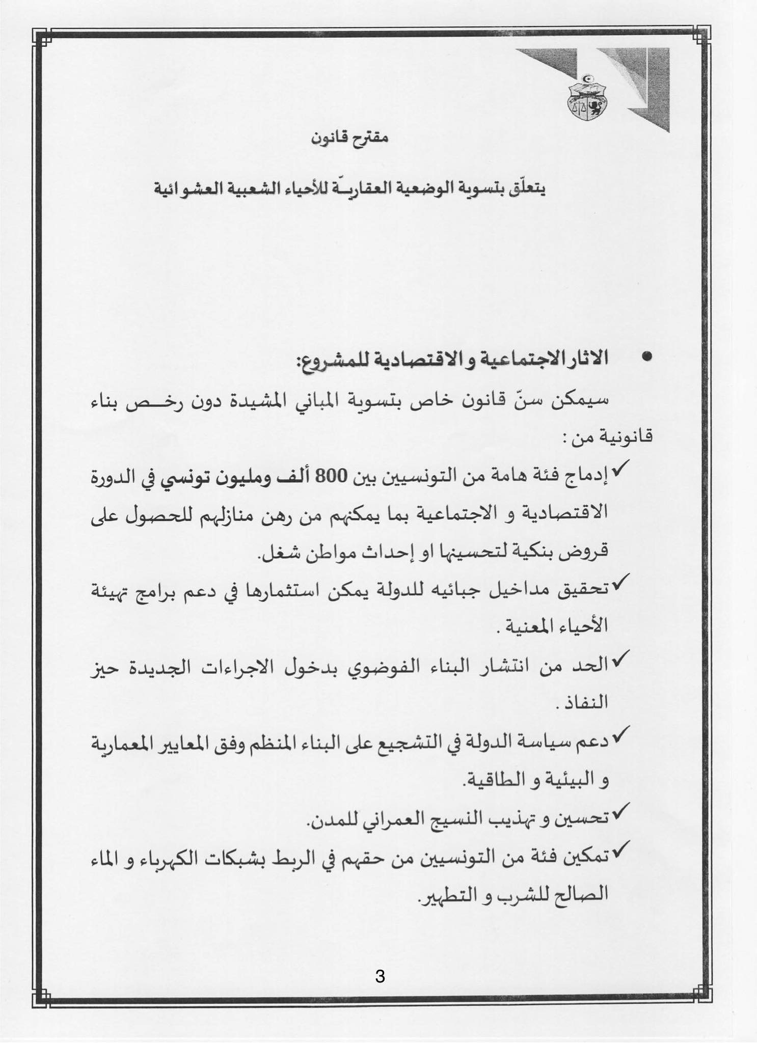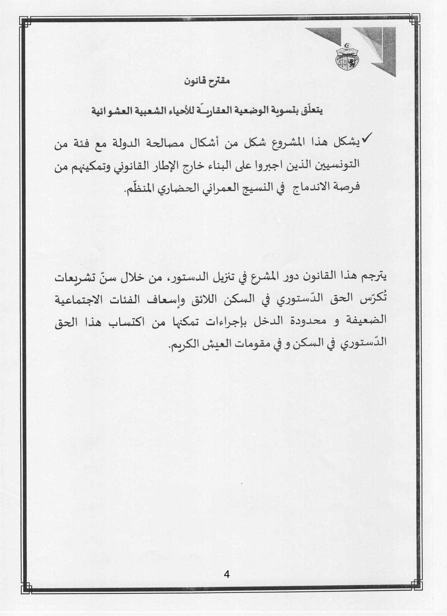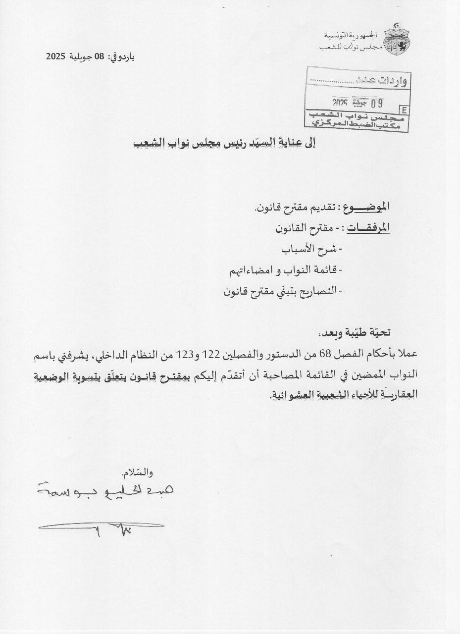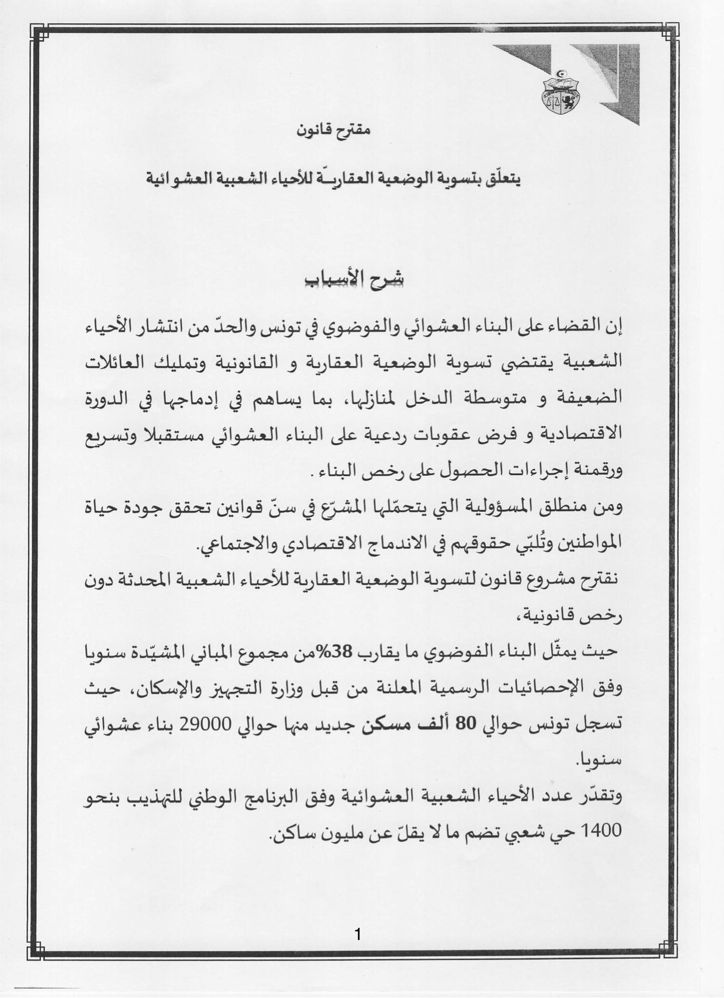 و إيمانًا منا بالمسؤولية التي وضعها أبناء شعبنا على عاتقنا، لاسيما من الفئات الضعيفة ومتوسطة ومحدودة الدخل، تقدّمنا ، و عدد من الزميلات والزملاء، بمشروع قانون يهدف إلى تسوية الوضعية القانونية والعقارية للمساكن المُشيّدة داخل الأحياء الشعبية غير المنظمة، والتي أُنجزت دون رخص بناء أو دون الحد الأدنى من مقومات العيش الكريم.