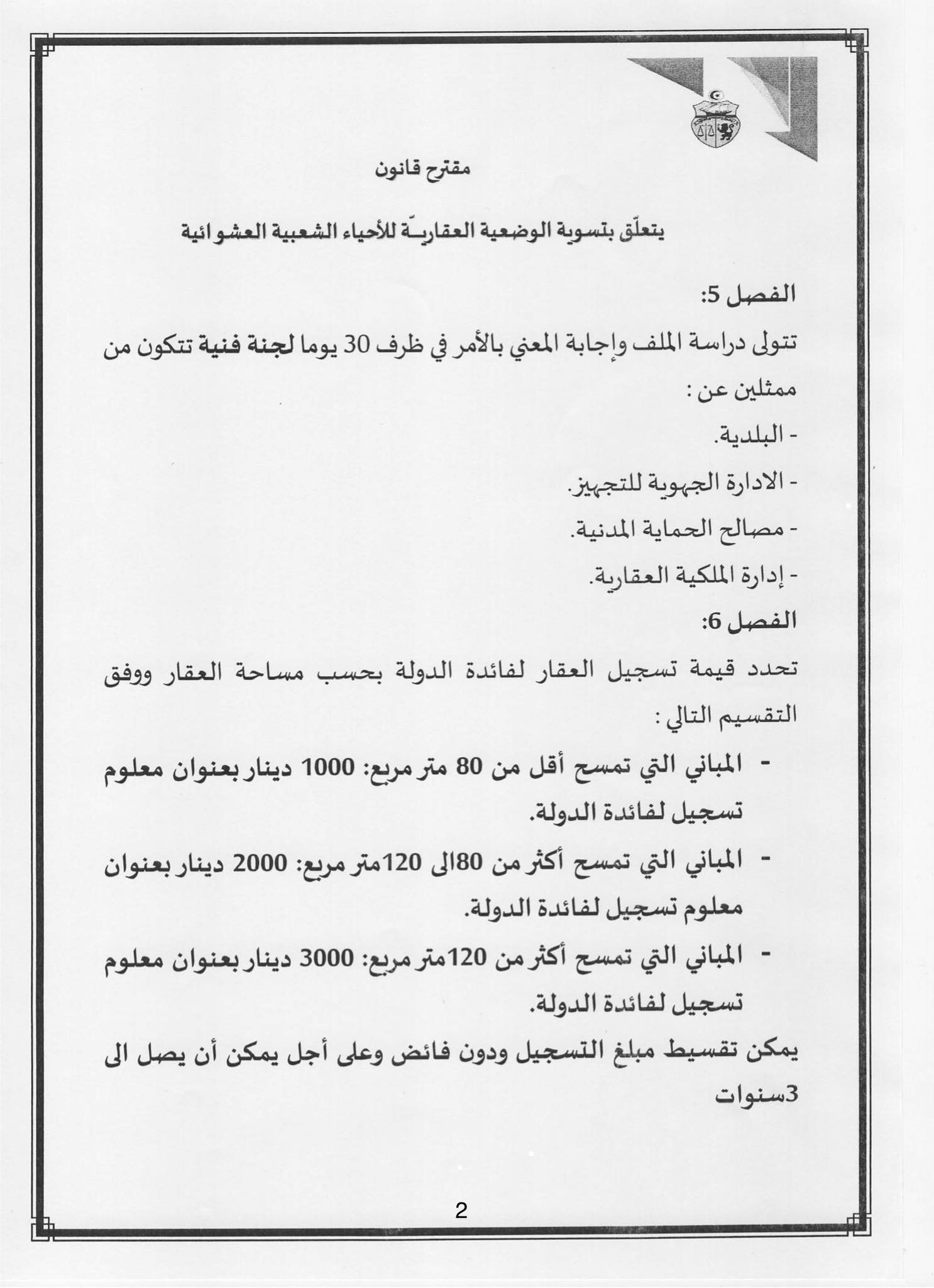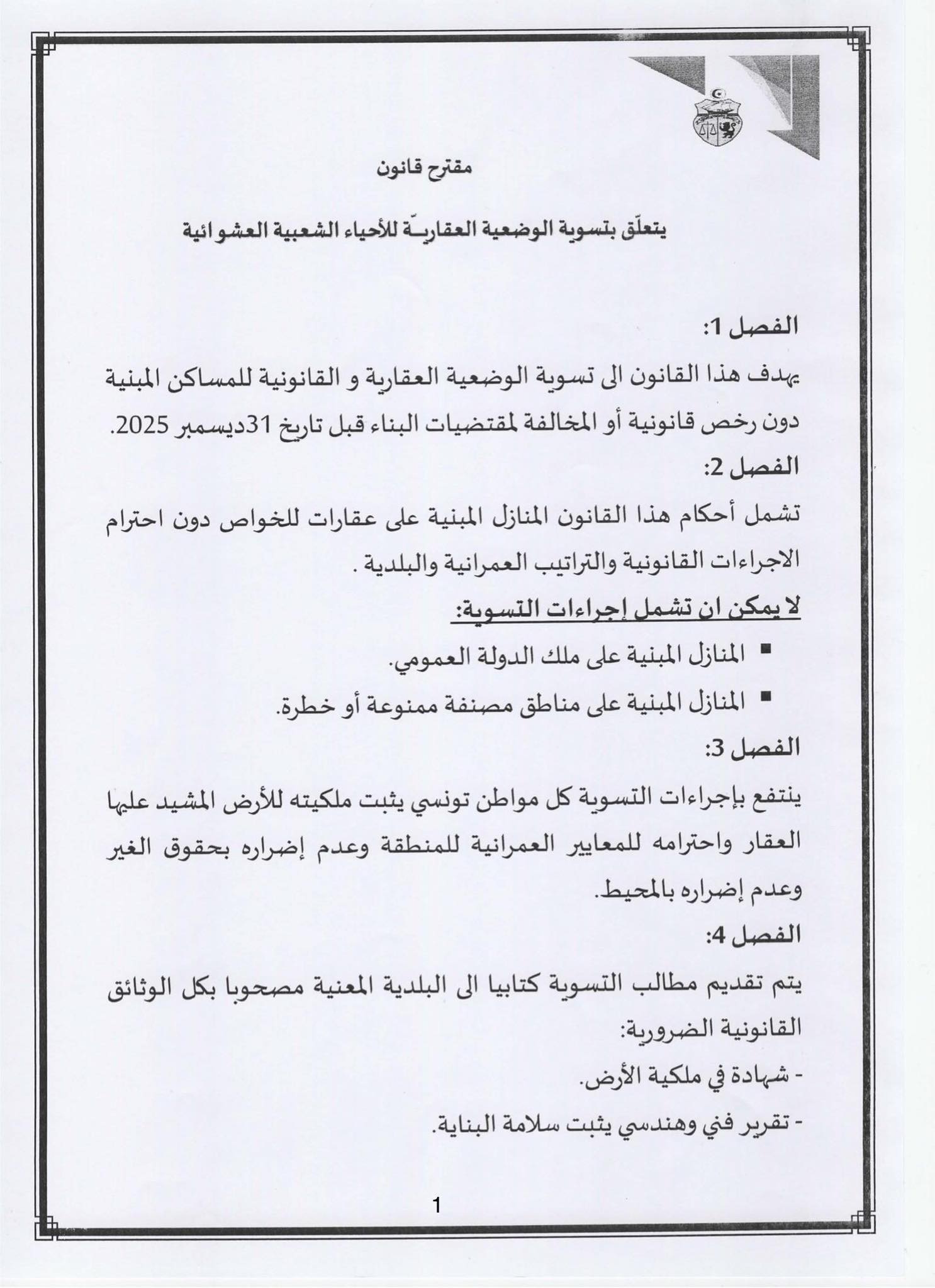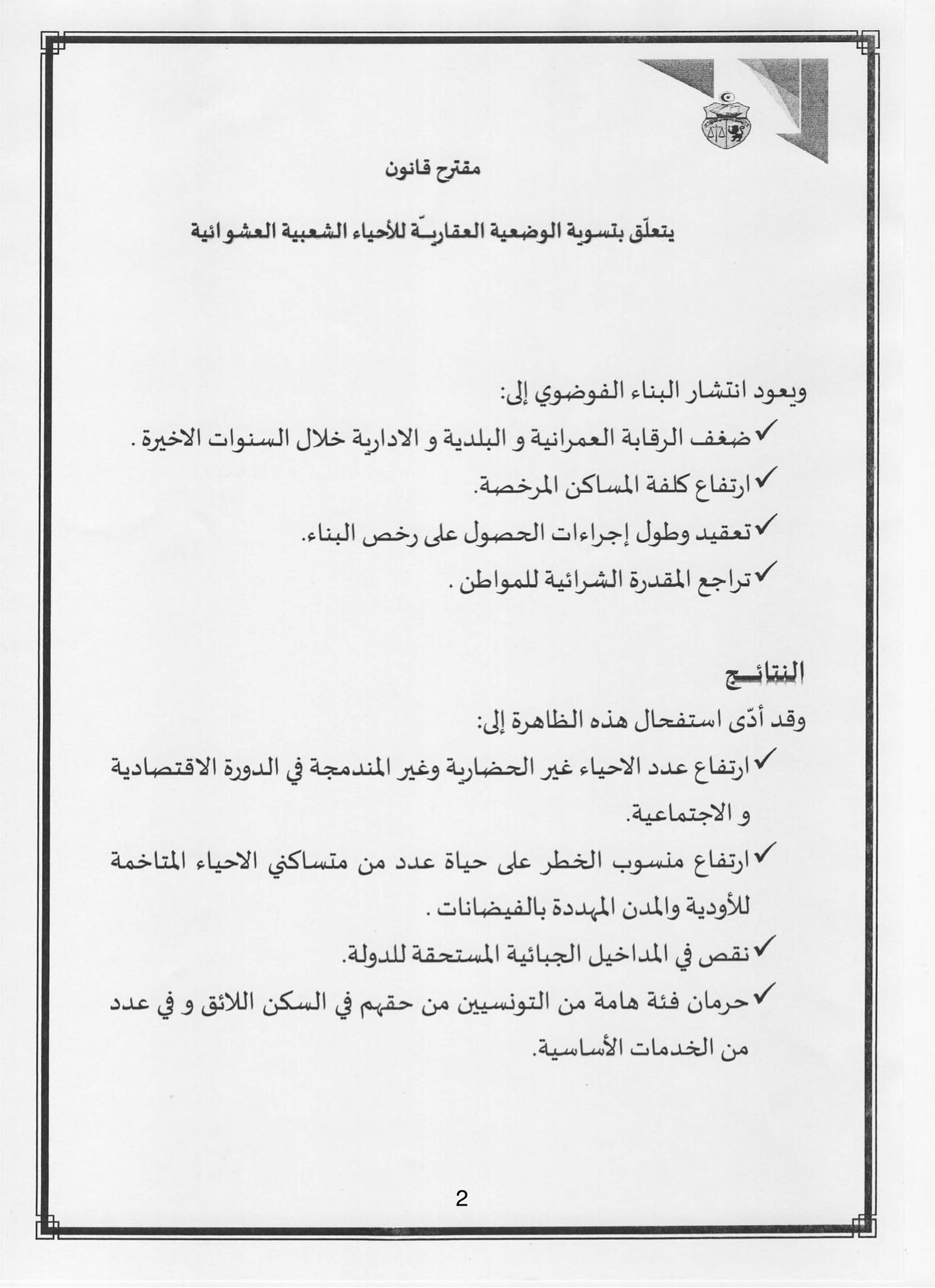 و إيمانًا منا بالمسؤولية التي وضعها أبناء شعبنا على عاتقنا، لاسيما من الفئات الضعيفة ومتوسطة ومحدودة الدخل، تقدّمنا ، و عدد من الزميلات والزملاء، بمشروع قانون يهدف إلى تسوية الوضعية القانونية والعقارية للمساكن المُشيّدة داخل الأحياء الشعبية غير المنظمة، والتي أُنجزت دون رخص بناء أو دون الحد الأدنى من مقومات العيش الكريم.