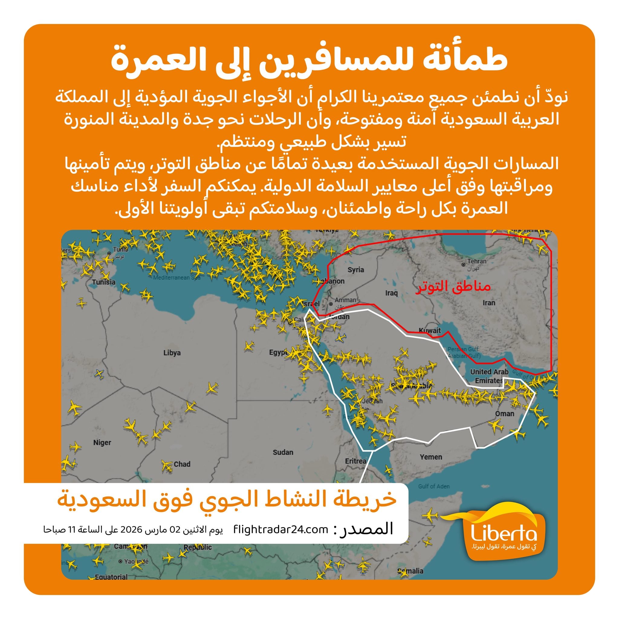 Nous confirmons également que tous les vols inclus dans les forfaits Liberta sont directs, opérés par la compagnie Saoudienne Airlines, sans escale ni transit par d’autres pays, et se déroulent conformément aux directives des autorités de l’aviation civile internationale, sur des trajectoires aériennes sûres, loin de toute zone de tension.